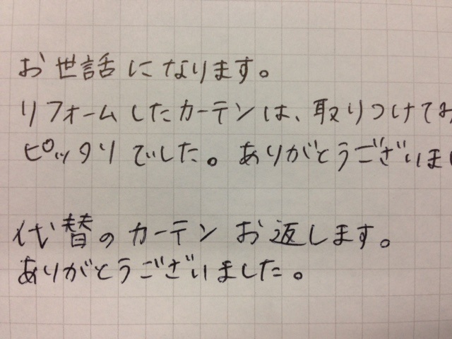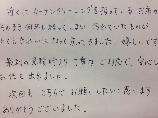 新居に越してから早三ヶ月が経ちますが、今日このように素敵なカーテンを取り付けて頂いて、ようやくマイホームという実感が湧いてきました。たかがカーテン、機能さえ果たせば良いのではないかと思うこともありましたが、部屋の大きな部分を占めるものですから、やはりこだわって良かったと思います。
