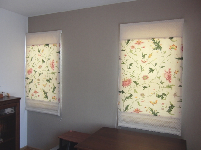 どれも素晴らしいお仕事ぶりでしたが、極めつけは、一台のシェードを二台にして頂いた妙技です。自分の書斎用に一番気に入っていたドレープカーテンに合わせてシェードを二窓分作りたかったのですが生地は一枚半分位しかありませんでした。足りない生地の上下に地の色と同じ色合いで文様の入った生地を足して頂いたのですが、これが期待を超える素晴らしい仕上がりでした。花柄の生地の上下に足された地紋のある生地は、まるで掛け軸の表層裂地のような趣となり、シェード全体が一枚の軸のような趣に仕上がりました。シェードをたたむと足して頂いた生地の中にすっぽりと収まり、まるでバランスの役割も果たしているかのようです!