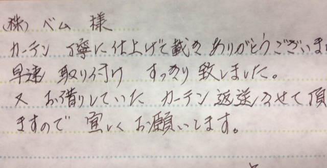 お世話になっております。お振込み後、ご連絡せず申し訳ございませんでした。本日、カーテンをお受けとりし窓にかけましたところ、サイズも雰囲気もととのっており大変満足しております。丁寧なお仕事に感謝いたします。また、機会がございましたら、ぜひとも宜しくお願い申し上げます。