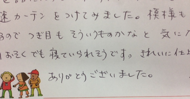 このたびはカーテンリフォームとクリーニングのご用命誠にありがとうございました。今回弊社の手違いでお直しに長くお時間をいただくことになり、またK様に大変ご面倒をおかけしてしまったにもかかわらず、このような暖かいコメントをいただき、スタッフ一同感激しております。あらためて心よりお礼申し上げます。ありがとうございました。これからもどうぞ宜しくお願い申し上げます。