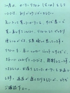 先日は、リフォームしたカーテンを送ってくださいまして、ありがとうございました。